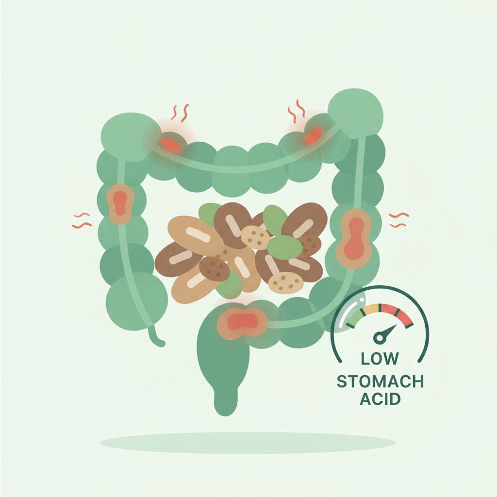 Low stomach acid is one of the most overlooked causes of bloating and indigestion. When your stomach doesn't have enough acid, food doesn't break down properly—it just sits there, fermenting.
